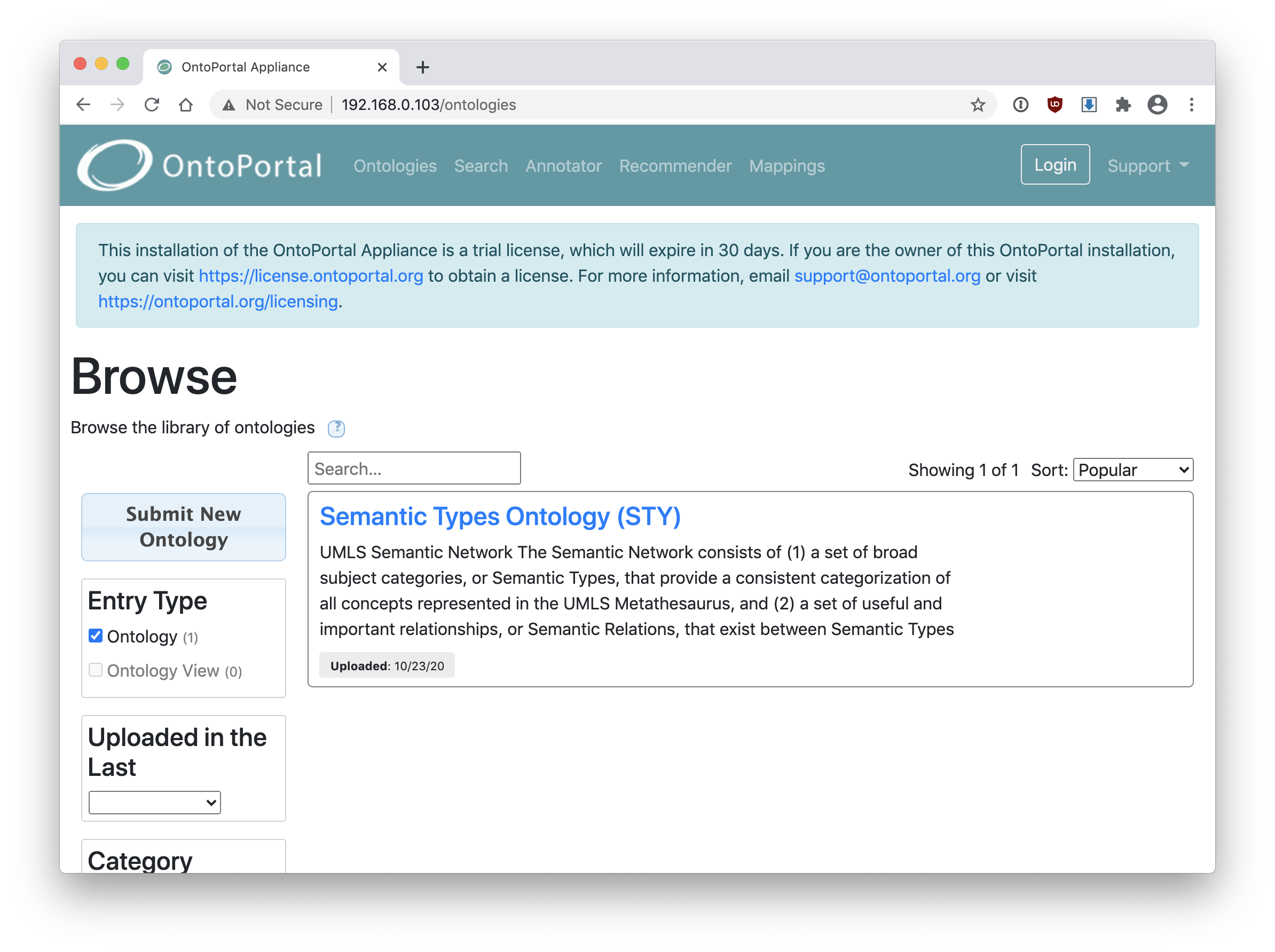 If the AllegroGraph switch completed successfully, clicking on the Ontologies link at the top should bring up this page with a single ontology, Semantic Types Ontology (STY):
