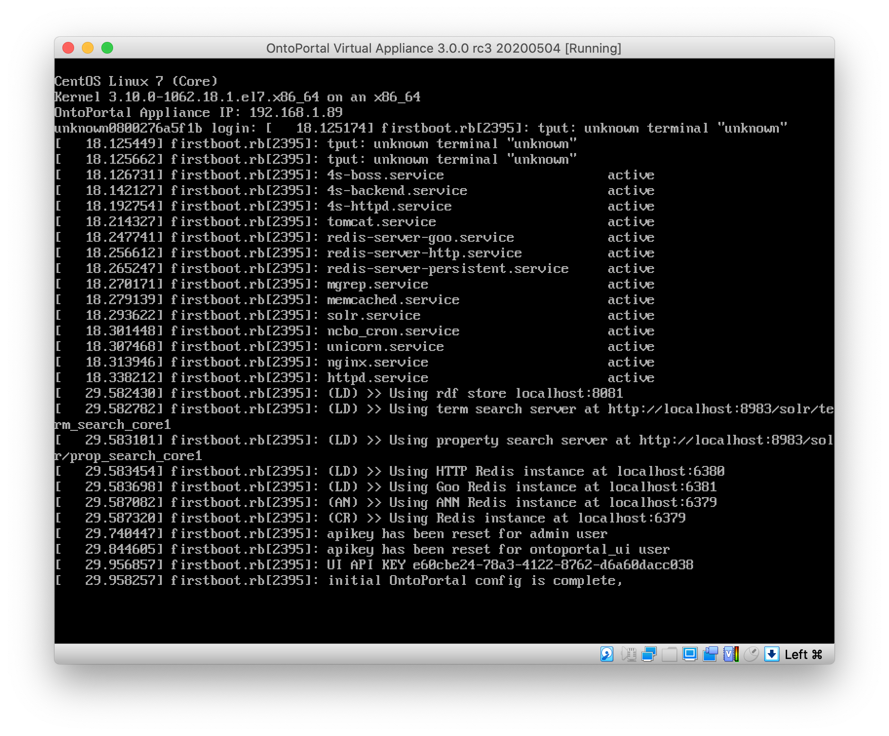 Even if you do not try to log in at that point, the bootup sequence continues, and the OntoPortal Virtual Appliance software also starts running. You will see the output associated with startup of the Appliance. Some details may differ if you are running a different Appliance version.